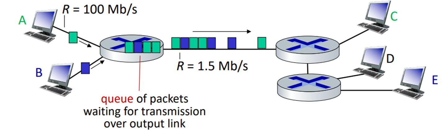 Packet queuing and loss: if arrival rate (in bps) to link exceeds transmission rate (bps) of link for some period of time.