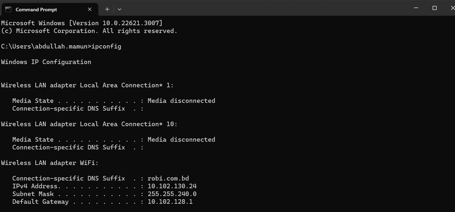 Type "ipconfig" in the command prompt and press "Enter", this gives us the IP address of the device.