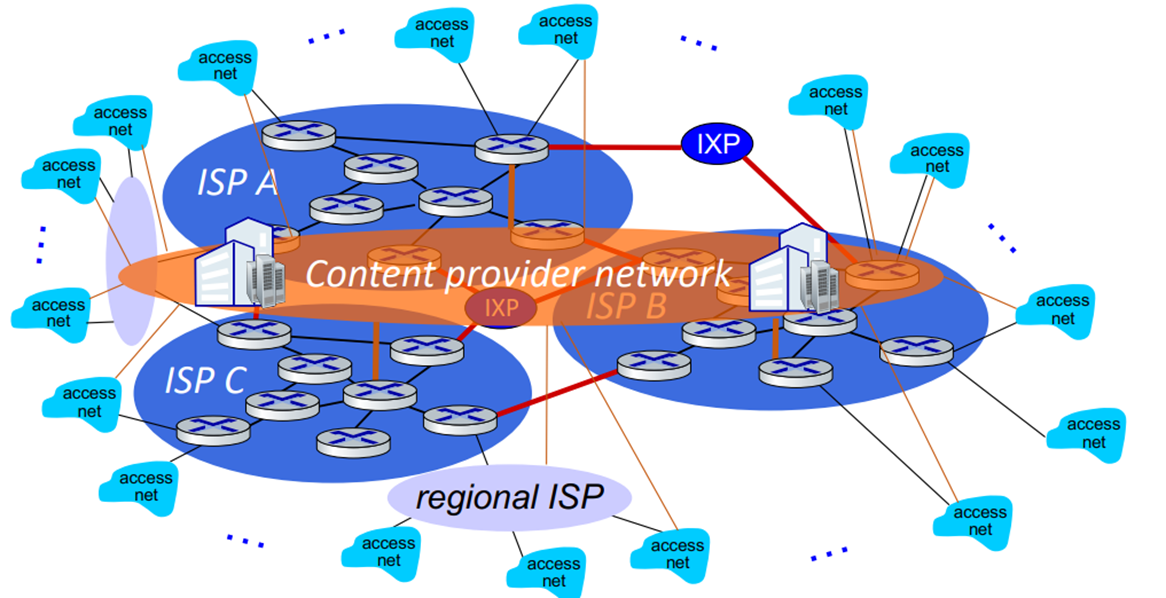 Content provider networks (e.g., Google, Facebook): private network that connects its data centers to Internet, often bypassing tier-1, regional ISPs
